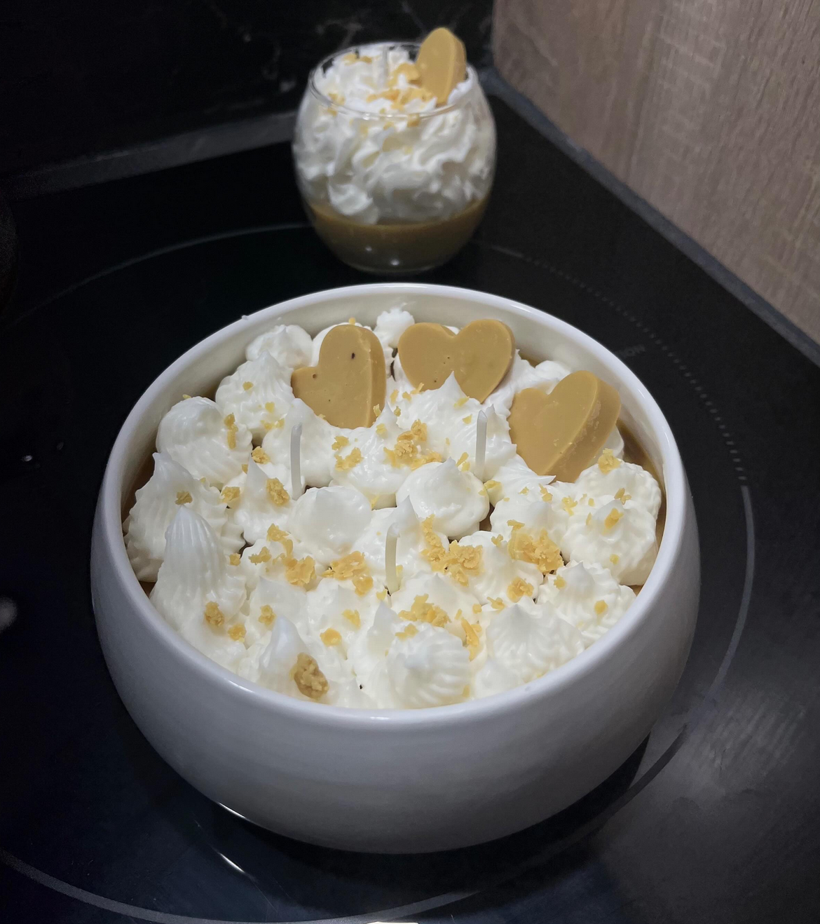 Nous sommes fiers de vous proposer une gamme de bougies gourmandes et de fondants parfumés, entièrement faits main avec passion et créativité. Chaque pièce est imaginée et confectionnée artisanalement, pour offrir une ambiance chaleureuse, unique et délicieusement parfumée à votre intérieur.
